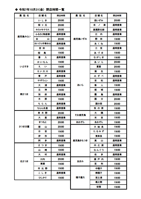 10月31日(金)営業時間のお知らせ