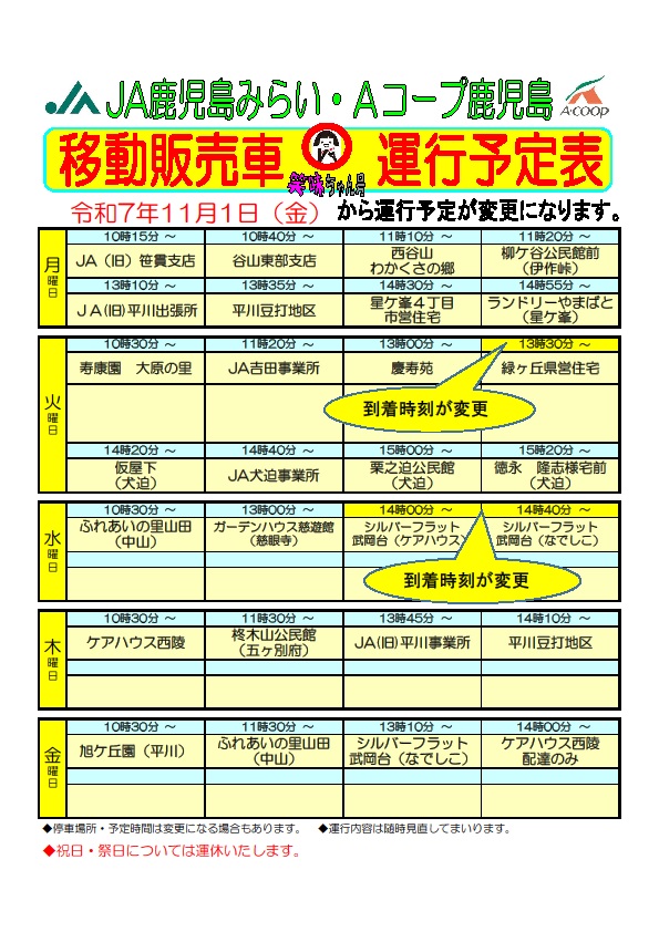 移動購買車【笑味ちゃん号】の一部巡回時刻が変更となります。