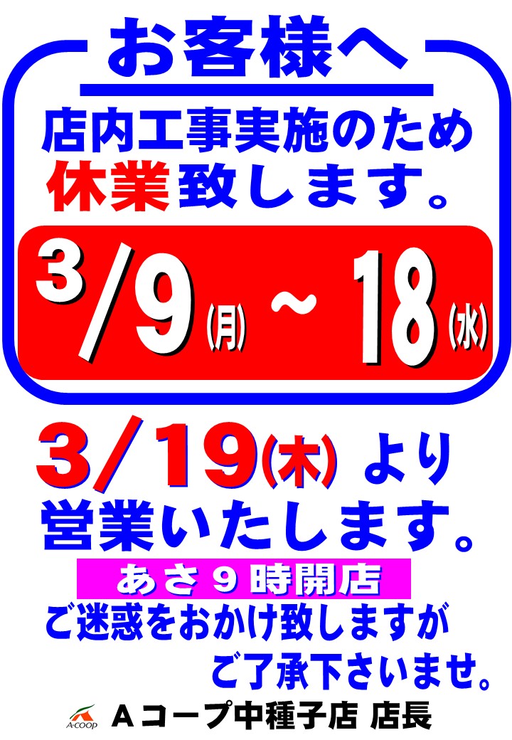 <店休日> 令和8年3月9日(月)~3月18日(水)