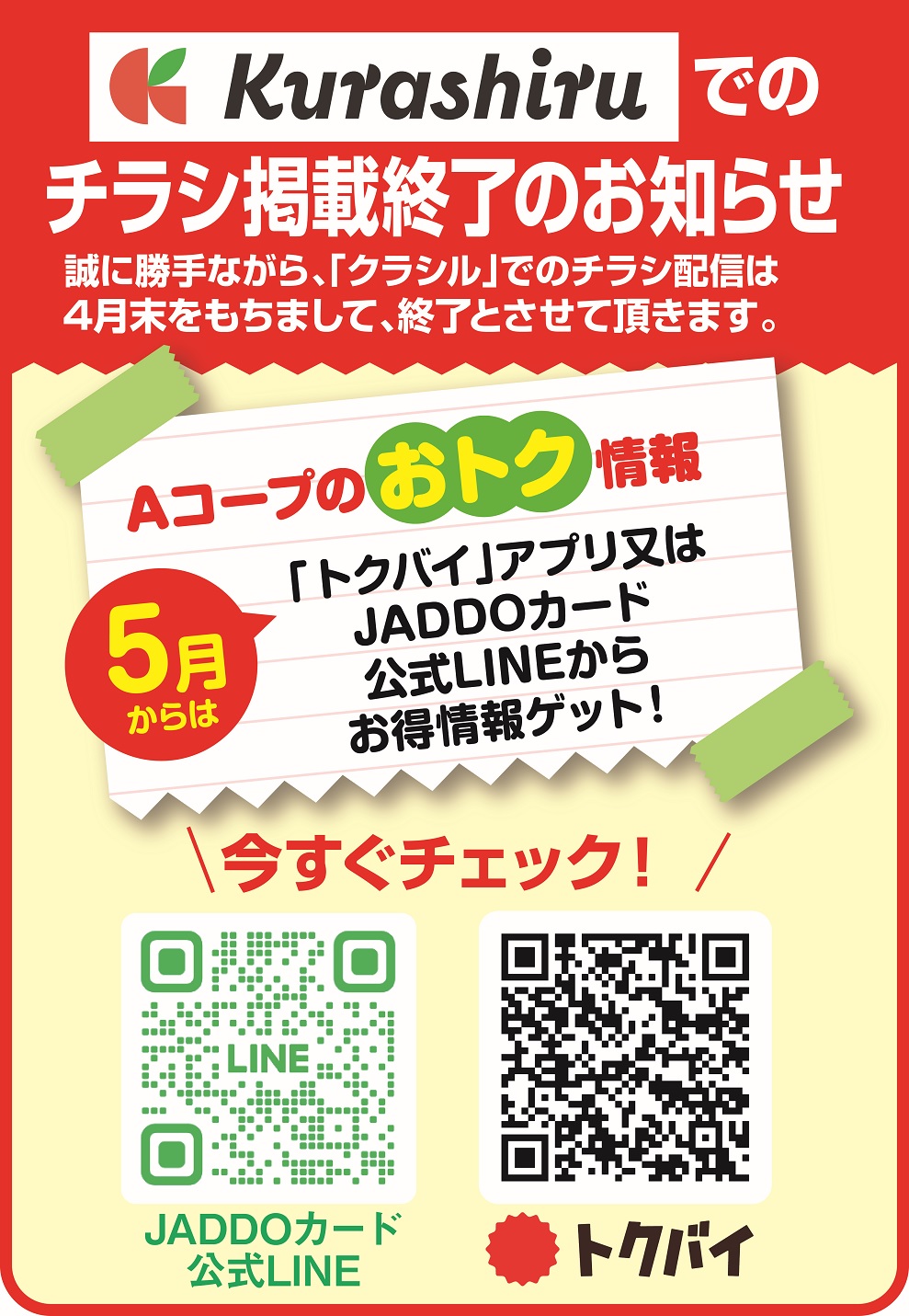 ◇ チラシ閲覧方法 ◇ ・JADDOカード公式LINE ・「トクバイ」アプリ ・ホームページ