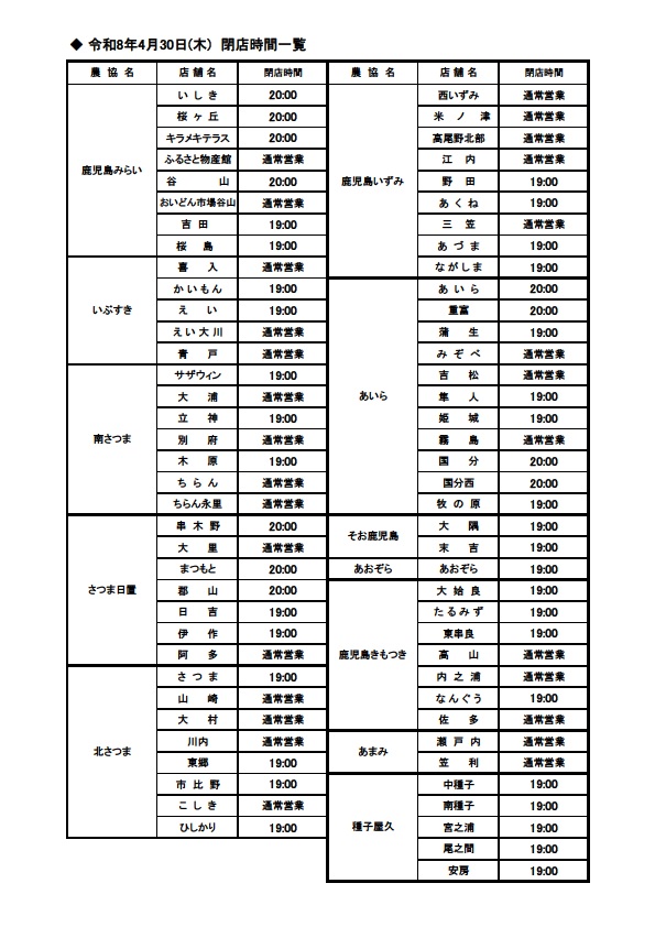 4月30日(木)営業時間のお知らせ